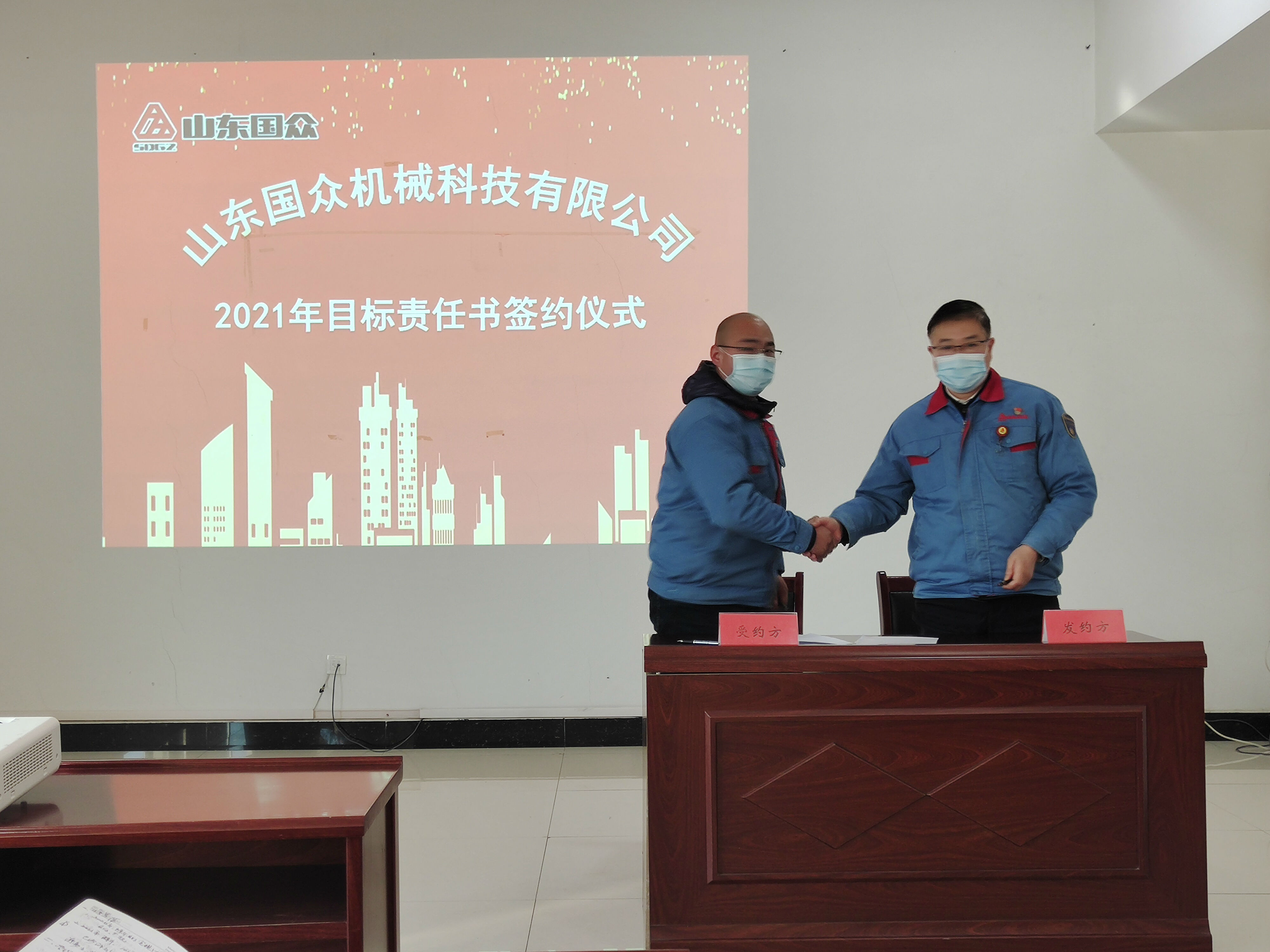 2021年1月19日下午,山東國眾在辦公樓一樓會議室舉行了 2021年度目標(biāo)責(zé)任書簽約儀式。公司領(lǐng)導(dǎo)、全體管理干部參加了此次簽約儀式,劉文吉常務(wù)副總經(jīng)理主持儀式。