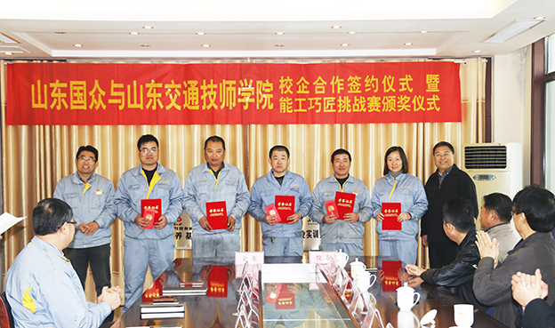2016年12月6日,山東國眾與山東交通技師學院校企合作暨山東交通技師學院第四屆技能節(jié)“能工巧匠”挑戰(zhàn)賽頒獎儀式在公司舉行。山東交通技師學院副院長任東等校方領(lǐng)導一行參加了本次校企合作揭牌儀式暨頒獎儀式,公司總經(jīng)理謝文成、常務副總經(jīng)理劉文吉、崔新平等公司領(lǐng)導及受獎員工部門長等參加了儀式活動。公司常務副總經(jīng)理劉文吉主持儀式。